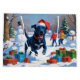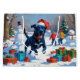Uma ilustração animadora de feriado mostrando um cachorro alegre brincando na neve, vestindo um chapéu de Papai Noel e cercado por caixas coloridas de presentes. Ao fundo, as crianças constroem um boneco de neve ao lado de uma árvore de Natal coberta de neve, criando uma alegre terra maravilhosa do inverno. Perfeito por espalhar alegria e capturar a magia do Natal.