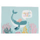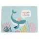 Um saco de presente de chá de fraldas com uma baleia doce com uma criança presa nas costas nadando pelo oceano e uma coleção colorida de gramíneas e corais marinhos. Inclui o ditado "baleia para o mundo".