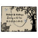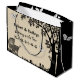 Adicione um toque pessoal ao seu presente. Uma bolsa de presente de chá de fraldas giro com a antiga rima do pátio da escola "Sentada na árvore, K-I-S-I-N-G" e o nome do casal, uma carruagem de bebê e suas iniciais gravadas na árvore.