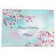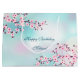 A cereja rosa bonito floresce num fundo de turquesa. Personalize-o com um texto de aniversário feliz e um nome em uma fonte elegante.
