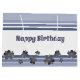 Saco de presente de papel branco e azul de estilo bolsa, personalize o texto de aniversário feliz para se adequar a qualquer ocasião especial ou o texto seja removível. Flores também são removíveis para ele, fundo branco e ou faixas largas da cinza podem ser trocadas para qualquer cor para complementar seu próprio estilo.