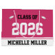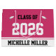 Este saco de presente magenta e branco diz "Classe 2025" em texto grande. (Você pode mudar o ano se precisar.) Na parte inferior, há texto preto que você pode alterar para mostrar o nome correto para o formando. Os bonés brancos estão de ambos os lados da frase "Classe de".