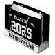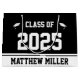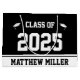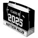 Este saco de presente preto e branco diz "Classe 2021" em grande texto branco. (Você pode mudar o ano se precisar.) Na parte inferior, há texto preto que você pode alterar para mostrar o nome correto para o formando. Os bonés brancos estão de ambos os lados da frase "Classe de".