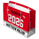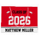 Este saco de presente vermelho, preto e branco diz 'Classe de 2026' em texto grande. (Você pode mudar o ano se precisar.) Na parte inferior, há texto preto que você pode alterar para mostrar o nome correto para o formando. Os bonés brancos estão de ambos os lados da frase "Classe de".