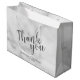 Clássico Elegante White Marble Wedding Favor Gift Bag com título 'Obrigado' na fonte moderna de cinza com nome e data na fonte sans serif moderna em fundo branco mármore.