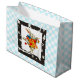 Grande saco de presente brilhante prato azul e branco de xadrez com uma imagem vintage, na frente, de Alice no coelho branco de Wonderland na regalia de cheio em um quadro preto-e-branco de Wonderland. Veja confetti correspondente, bolsa de favor, caixa de favor, etiqueta de favor quadrada, etiqueta, adesivo quadrado e papel de embalagem. Veja toda a coleção Wonderland Gift Bag nos TOUCHES ESPECIAIS | Seção Favoritos para festas.