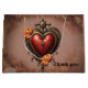 Coração Steampunk com Flores. Um coração ao estilo steampunk, predominantemente vermelho com fendas visíveis, encapsulado em um quadro de ouro de ornamentado. O quadro incorpora elementos de relógio e é adornado com flores laranja. O fundo é um cor-de-rosa suave, mutado, com padrões florais em ouro e marrom. O humor é romântico com um toque de estética mecânica e de vintagem.
