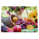 Saco de presentes com fotografia de uma mesa cheia de naturezas. Preparado com cornucopia, legumes e frutas coloridos.