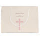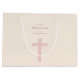 Estas primeiras características de design bonitas e simples do comunhão santamente um fundo bege e cor-de-rosa pastel com uma cruz cor-de-rosa. Ame as grandes memórias do primeiro comunhão santamente da sua criança com este design bonito. Verifique para fora os primeiros acessórios do comunhão santamente, artigos de papelaria, e presentes de harmonização do comunhão.