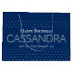 Cute heart pattern elegant and modern customizable large gift bag. The design features small, repeating white heart shapes, personalized text and name. The name "CASSANDRA" uses a bold, eye-catching font while the text "HAPPY BIRTHDAY" and "with love, from Elizabeth xxx" use a simple, complementary font/script. The color shame is a popular combination of navy blue and white. This stylish and classic gift bag is well-suited for birthdays, wedding anniversaries and Mother's Day.