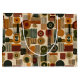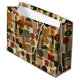 Sophisticated mid-century geometric pattern gift bag featuring layered circles, arches, triangles, and rectangles in forest green, burnt orange, ochre, and cream on a black background. Rich textures and retro-modern shapes create a bold design ideal for Bauhaus lovers, vintage décor fans, and anyone drawn to moody modern style.