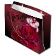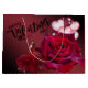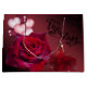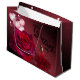 fondo de color cereza degradado y mujer vestida de rojo estilo fiesta rodeada de hojas de rosas rojas y una rosa grande con globos en forma de corazones rosas.