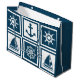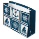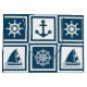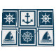 Design com temas náuticos, com roda de vela, barco à vela, bússola e decoração da âncora, em quadrados brancos e azuis com faixas