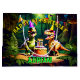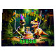 Dino, quatro festas de aniversário coloridas de dinossauros, bolsa de presente de aniversário personalizada de feliz aniversário, dinossauros vestindo chapéus de festa com um saco de presente de aniversário de dinossauros