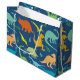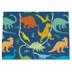 Teste padrão colorido da silhueta dos dinossauros. Tiranossauro Rex, titanosaurs, Triceratop, raptores, Ankylosaurs, Dino-Pássaros, Stegosaurus, Apatosaurus, Pteranodon e mais em um teste padrão colorido no fundo azul, e dinossauros em verde, em azul, em amarelo e laranja.