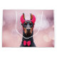 O Doberman Pinscher, cão de raça negra e castanha, vestindo chifres-do-diabo cor-de-rosa brilhante numa faixa de cabeça cor-de-rosa e uma gravata de bolso rosa. Colocado sobre um fundo de flare de boque rosa.