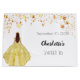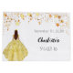 Um fundo branco decorado com estrelas ouros e uma menina vestindo uma tiara e um vestido dourado. Personalizar e adicionar nome, data.