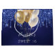 Uma bolsa de presente para uma menina e glamourosa Doce 16, 16 anos. Um fundo azul marinho decorado com gotas de brilho e balões de ouro. A cor azul é irregular. Personalize e adicione uma data, nome e idade. O texto: O nome é escrito em branco com um script de estilo moderno, escrito à mão