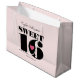 Celebre um doce décimo sexto com um saco de presentes personalizado! Perfeito para a estrela de aniversário que ama vibrações vintage e estilo ousado. A design apresenta 'Doce 16' na tipografia trópica, sobreposta com um coração de amor. Personalize a modelo com o nome da adolescente em um roteiro de tendências e a data de aniversário. Uma apresentação legal para uma filha adolescente, irmã, sobrinha ou melhor amiga! Cores impressas: cor-de-rosa, cor-de-rosa-pincel e preto.