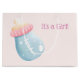 Saco de presentes com uma imagem fofa de uma garrafa de bebê azul-claro com uma jante rosa.