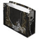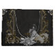 Elegância em prata e preto. Esta imagem mostra uma ilustração em preto e branco de uma estrutura de casamento com ouro intrincado e embelezamentos de prata. O quadro é adornado com padrões florais de ornamentado e um arco central. Uma noiva de vestido, segurando um buquê, fica dentro do quadro, virada para longe do espectador. O fundo é uma superfície preta texturizada, criando uma atmosfera dramática e elegante.