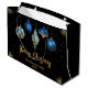 Celebrate the season in style with this elegant black Christmas gift bag featuring five royal blue and gold hanging ornaments, scattered golden stars, and customizable text. Add your family name and year for a personal touch that elevates any holiday gift. Perfect for festive packaging, party favors, or under-the-tree presentation.