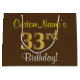 Este simples e elegante design de presente de aniversário apresenta uma mensagem personalizada como "33º Aniversário do CustomName!" (com o "33º" a ter um aspecto de cor falsa/imitação em forma de ouro) sobre um fundo de cor castanha. O nome está em texto amarelo, parecido com script, e pode ser personalizado. Um saco de presente de aniversário personalizado como este poderia talvez ser usado quando se dá um presente ou presente a alguém que comemora seus trinta e três anos. [~Z0000262]