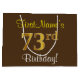 Este simples e elegante design de presente de aniversário apresenta uma mensagem personalizada como "73º Aniversário do Primeiro Nome!" (com o "73º" a ter um visual falsa/imitado de cor dourada) sobre um fundo castanho. O nome está em texto amarelo, parecido com script, e pode ser personalizado. Um saco de presente de aniversário personalizado como este poderia talvez ser usado quando se dá um presente ou presente a alguém que comemora seu setenta e terceiro aniversário. [~Z0000262]