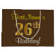 Este simples e elegante design de presente de aniversário apresenta uma mensagem personalizada como "26º Aniversário do Primeiro Nome!" (com o "26º" a ter um visual falsa/imitado de cor dourada) sobre um fundo castanho. O nome está em texto amarelo, parecido com script, e pode ser personalizado. Um saco de presente de aniversário personalizado como este poderia talvez ser usado quando se dá um presente ou presente a alguém que comemora seu vigésimo sexto aniversário. [~Z0000262]
