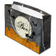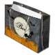 Saco de presente de na moda Halloween com design gótico, com morcegos, abóboras laranja, e a palavra "Boo!" em um roteiro elegante. Perfeito para embrulhar favores da festa de Halloween, presentes assustadores ou aniversários de outono. Um saco sazonal reutilizável que adiciona um toque sofisticado à oferta de férias.