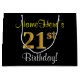 Este simples e elegante design de presente de aniversário apresenta uma mensagem personalizada, como "NameHere's aniversário de 21 anos!" (com as "21ruas" a terem um visual falsa/imitado de cor dourada) sobre um fundo de cor preta. O nome está em texto amarelo, parecido com script, e pode ser personalizado. Um saco de presente de aniversário personalizado como este poderia talvez ser usado quando se dá um presente ou presente a alguém que comemora seu vigésimo primeiro aniversário. [~Z0000258]