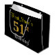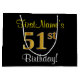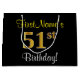 Este simples e elegante design de presente de aniversário apresenta uma mensagem personalizada, como "FirstName’s 51rua Birthday!" (com a "51ruas" a ter um visual falsa/imitado de cor dourada) sobre um fundo de cor preta. O nome está em texto amarelo, parecido com script, e pode ser personalizado. Um saco de presente de aniversário personalizado como este poderia talvez ser usado ao dar um presente ou presente a alguém que comemora seu cinquenta aniversário. [~Z0000258]