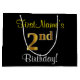 Este simples e elegante design de presente de aniversário apresenta uma mensagem personalizada como "segundo aniversário do Primeiro Nome!" (com o "segundo" a ter um aspecto de cor falsa/imitação dourada) sobre um fundo de cor preta. O nome está em texto amarelo, parecido com script, e pode ser personalizado. Uma bolsa de presente de aniversário personalizada como esta poderia talvez ser usada quando se dá um presente ou presente a alguém que comemora seu segundo aniversário. [~Z0000258]