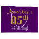 Este simples e elegante design de presente de aniversário apresenta uma mensagem personalizada como "Name-Here's 85th Birthday!" (com o "85º" a ter um visual falsa/imitado de cor dourada) sobre um fundo cor roxa. O nome está em texto amarelo, parecido com script, e pode ser personalizado. Uma bolsa de presente personalizada de aniversário como esta poderia talvez ser usada quando se dá um presente ou presente a alguém que comemora seu oitenta e cinco anos. [~Z0000255]