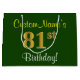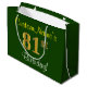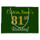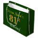 Este simples e elegante design de presente de aniversário apresenta uma mensagem personalizada, como "81ruas Birthday!" (com a "81ruas" a ter um visual falsa/imitado de cor dourada) sobre um fundo de cor verde. O nome está em texto amarelo, parecido com script, e pode ser personalizado. Um saco de presente de aniversário personalizado como este poderia talvez ser usado ao dar um presente ou presente a alguém que comemora seu oitenta aniversário. [~Z0000254]