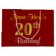 Este simples e elegante design de sacola de presente de aniversário apresenta uma mensagem personalizada como "Nome-Aqui está o seu 20º Aniversário!" (com o "20º" tendo uma aparência de coloração dourada falsa/imitada) em um fundo de cor vermelha. O nome está em texto de cor amarela, semelhante a uma escrita cursiva, e pode ser personalizado. Uma sacola de presente de aniversário personalizada como esta poderia ser usada ao dar um presente ou oferta a alguém que está celebrando seu vigésimo aniversário.