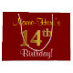 Este simples e elegante design de presente de aniversário apresenta uma mensagem personalizada como "Name-Here's 14 Birthday!" (com o "14" a ter uma aparência falsa e imitada de cor dourada) sobre um fundo de cor vermelha. O nome está em texto amarelo, parecido com script, e pode ser personalizado. Um saco de presente de aniversário personalizado como este poderia talvez ser usado ao dar um presente ou presente a alguém que comemora seu décimo quarto aniversário. [~Z0000253]