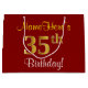 Este simples e elegante design de presente de aniversário apresenta uma mensagem personalizada como "NameHere's 35th Birthday!" (com o "35º" a ter um visual falsa/imitado de cor dourada) sobre um fundo de cor vermelha. O nome está em texto amarelo, parecido com script, e pode ser personalizado. Um saco de presente de aniversário personalizado como este poderia talvez ser usado quando se dá um presente ou presente a alguém que comemora seus trinta e cinco anos. [~Z0000253]