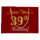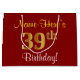 Este simples e elegante design de presente de aniversário apresenta uma mensagem personalizada como "Name-Here's 39th Birthday!" (com o "39º" a ter uma aparência falsa e imitada de cor dourada) sobre um fundo de cor vermelha. O nome está em texto amarelo, parecido com script, e pode ser personalizado. Um saco de presente de aniversário personalizado como este poderia talvez ser usado quando se dá um presente ou presente a alguém que comemora seu trigésimo nono aniversário. [~Z0000253]