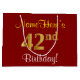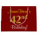 Este simples e elegante design de presente de aniversário apresenta uma mensagem personalizada como "NameHere's 42nd Birthday!" (com o "42º" a ter um visual falsa/imitado de cor dourada) sobre um fundo de cor vermelha. O nome está em texto amarelo, parecido com script, e pode ser personalizado. Um saco de presente de aniversário personalizado como este poderia talvez ser usado quando se dá um presente ou presente a alguém que comemora seu quarenta e segundo aniversário. [~Z0000253]
