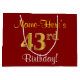 Este simples e elegante design de presente de aniversário apresenta uma mensagem personalizada como "Name-Here's 43rd Birthday!" (com o "43º" a ter um visual falsa/imitado de cor dourada) sobre um fundo de cor vermelha. O nome está em texto amarelo, parecido com script, e pode ser personalizado. Um saco de presente de aniversário personalizado como este poderia talvez ser usado quando se dá um presente ou presente a alguém que comemora seu quarenta e terceiro aniversário. [~Z0000253]