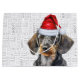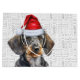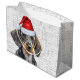 Amantes de cães adorarão receber ou dar esta sacola de presentes de férias fofinha, com um Dachshund de cabelos bonitos em um chapéu de Papai Noel em um divertido fundo de arte de palavras em matizes de cinzas suaves em tons brancos.