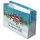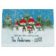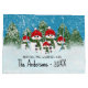 Família de bonitinhos e bonitinhos de cinco, com uma colmeia vermelha e um cachecol verde parados diante de uma floresta de pinheiros enquanto neva. Personalize e personalize a bolsa de presente de Natal feliz e Feliz ano novo com seu nome familiar.