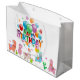 Um grande saco de presentes de alpacas dançantes que é colorido com letras e balões