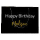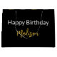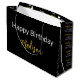 A bolsa de presente de aniversário feliz é preta. O nome do destinatário em um faux gold script e a frase Happy Birthday está acima do nome. O nome (Mostrado: Madison) aparece num guião de ouro elegante (e não em folha). O outro texto é branco. Todo o texto pode ser editado.