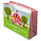 Essa bolsa de presente fofa e divertida pode ser personalizada com um nome ou título como filho, neto, sobrinho, amigo etc. Ele apresenta um cabeleireiro loiro com pele escura ao lado de um celeiro vermelho com um furacão de galo. Há animais de fazenda adoráveis como uma vaca, porco e galinha. Ao fundo está um céu azul brilhante, macieiras, sol, borboletas e margaridas.