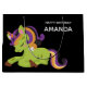 Saco de presente de aniversário com uma imagem de um unicórnio estilo Frankenstein. Cor roxa e verde. Muito fofo.