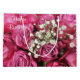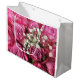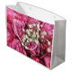 Esta bolsa de presente de aniversário apresenta um buquê de rosas cor-de-rosa e o hálito do bebê branco.