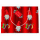 Esta bolsa de presente de Natal giro tem um padrão vermelho brilhante de pequenos elfos de Natal (ou Papais noeis auxiliares) com chapéus vermelhos, pontiagudos e barbas longas e pontiagudas. À sua volta estão pequenas canetas doces, cartazes de Natal felizes e meias de Natal listradas e multicoloridas.