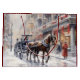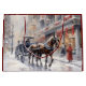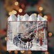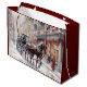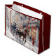 Saco de presente de férias com ilustração clássica de feriado vitoriano de uma paisagem urbana com edifícios enfeitados em arcos vermelhos, lojas de férias e um fazer puxado por carruagem puxado para o cavalo, a caminho da noite de neve.